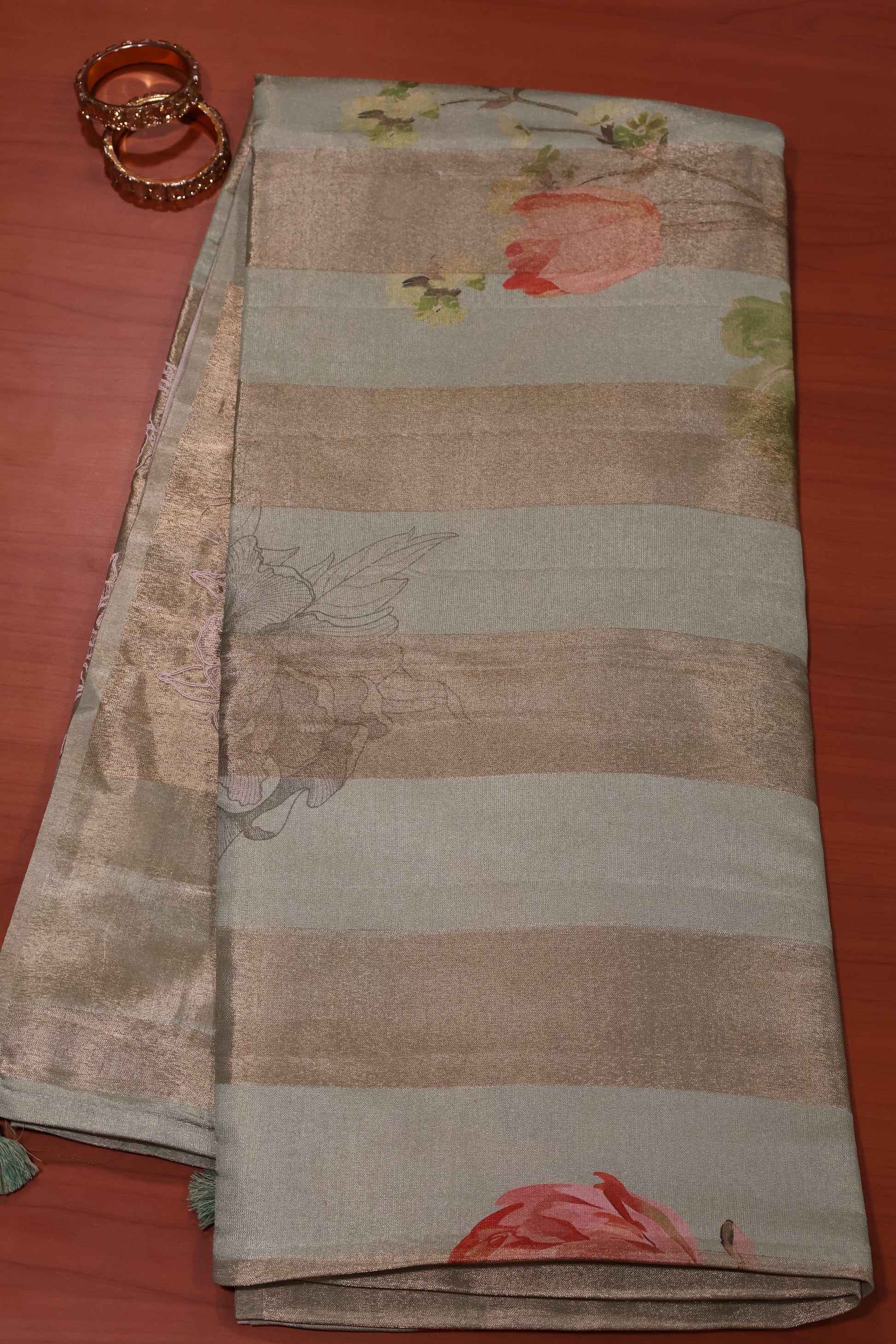 Tissue Linen Saree-Green Flower With Sparrow Embryoid
